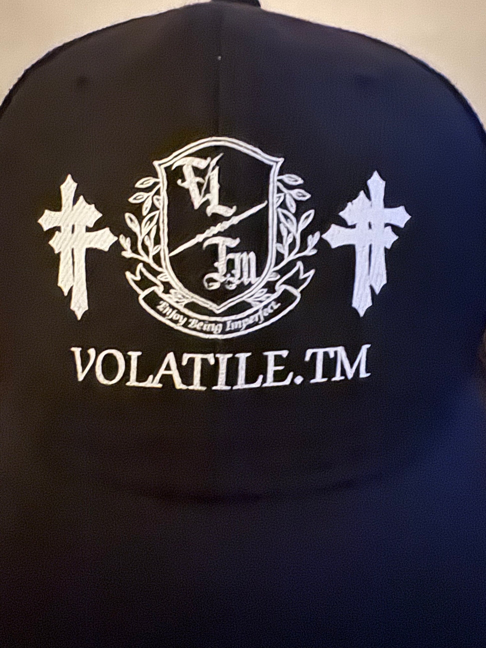 The Cross Hat presents a sophisticated black design, framed by a distinct white border on the front panel. Featuring the VOLATILE.TM name styled in traditional Old English typography, it evokes the exclusivity of a private members club. The centerpiece includes two double crosses flanking a shield adorned with intricate vine details. Beneath the shield, the phrase "enjoy being imperfect" invites a refined reflection on individuality. This hat expertly balances classic symbolism with contemporary fashion, offering a distinguished accessory for the discerning wearer.