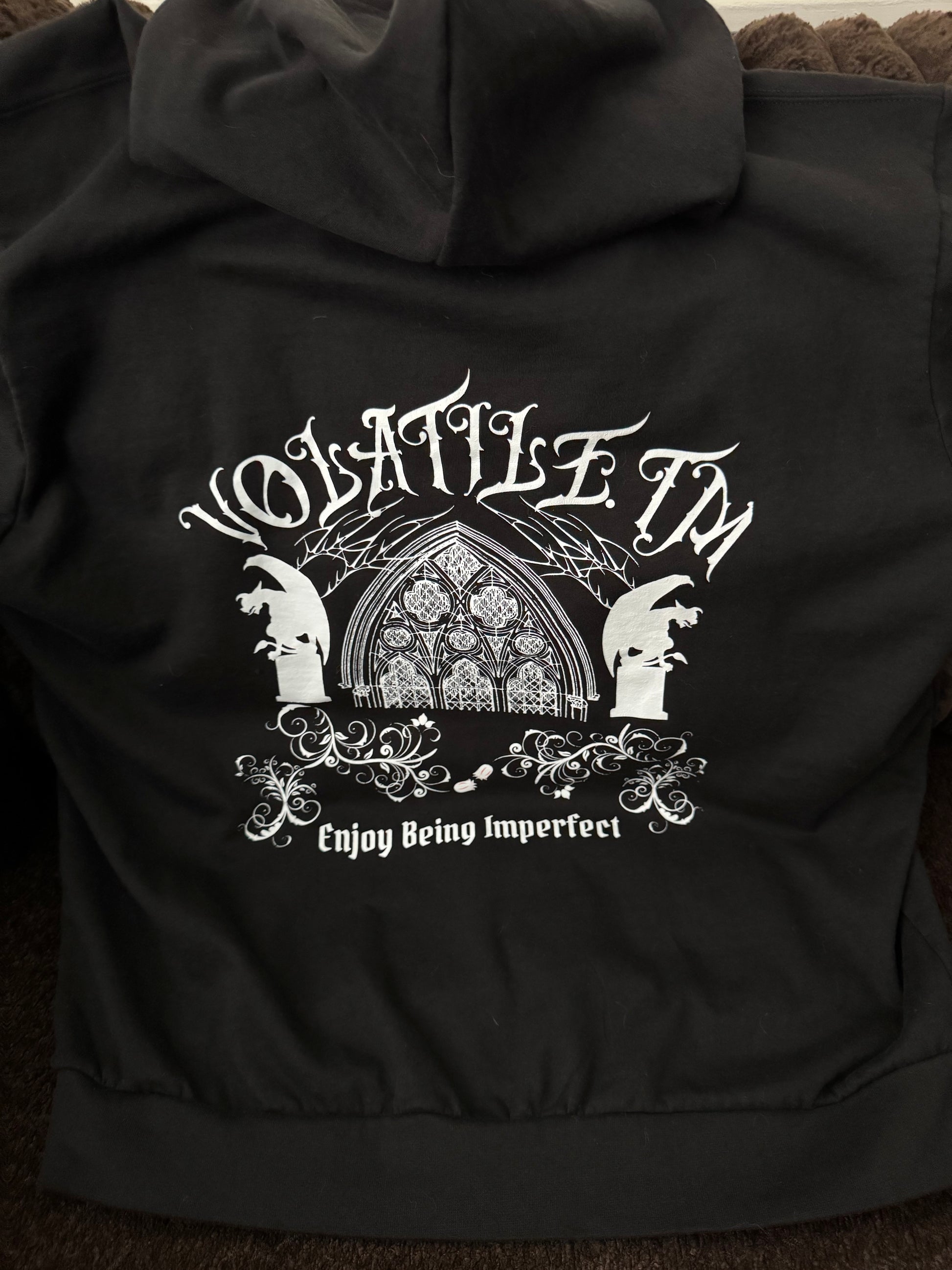 This black Gothic Hoodie showcases a striking Gothic arch banner and an intricately styled gothic design on the back. Crafted from 100% cotton, it offers natural breathability and comfort. For a relaxed, oversized fit, we recommend choosing one size larger than your usual. It combines classic gothic aesthetics with everyday wearability for a unique style statement. This hoodie can be worn and styled with or without the adjustable drawstrings.