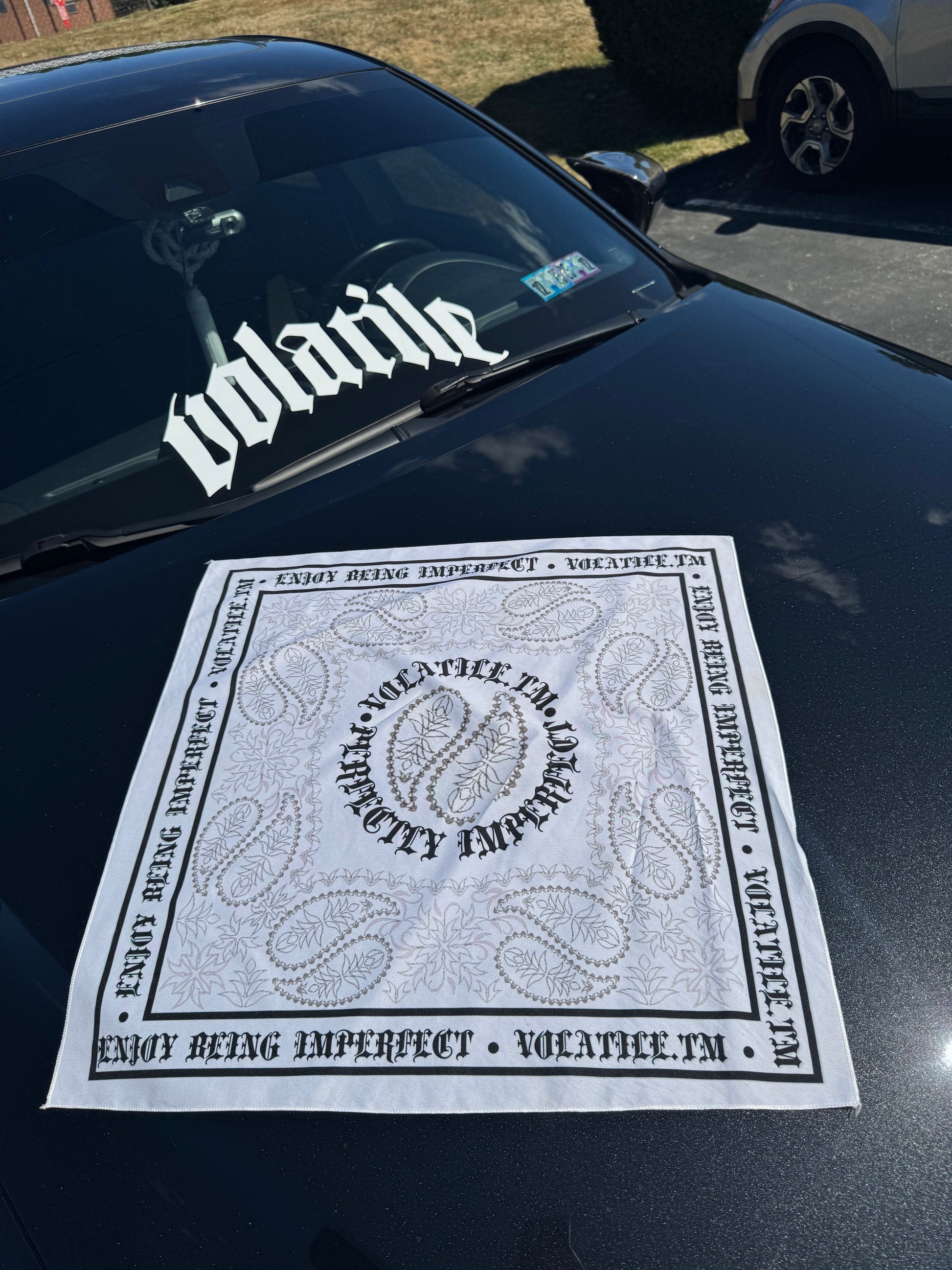 Elevate your style with the Volatile Bandana, a white tribal-inspired accessory featuring the distinctive Volatile.TM branding and the phrase "Enjoy being imperfect" in elegant Old English font. Designed for versatile use, it can adorn your side mirror, rear seat hanger, or be worn as a statement piece, blending refined aesthetics with everyday functionality.